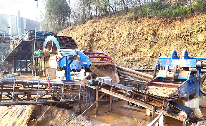 通過輪式洗砂機與擦洗機相結(jié)合,洗擦一體使物料與物料充分摩擦去 除表面附著物。混合物料首先進入擦洗機進行充分擦洗,達到泥砂分離效果。